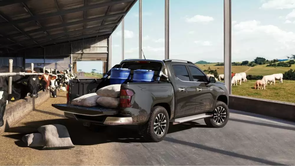 Já a traseira mantém o tradicional eixo rígido com feixe de molas, reforçando a vocação utilitária da picape e sua capacidade de carga de 1.020 kg. O sistema de freios, com discos ventilados nas quatro rodas, assegura frenagens precisas mesmo em situações de carga total ou reboque, que pode chegar a 3.500 kg.