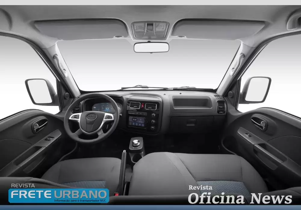 O VUC elétrico da JAC também se destaca pela lista de equipamentos: direção elétrica, ar-condicionado, central multimídia com tela LCD, vidros e retrovisores elétricos, volante multifuncional, airbag duplo, câmera de ré, sensor de estacionamento, luzes diurnas em LED, monitoramento de pressão dos pneus (TPMS), assistente de subida (HSA) e controle de tração (ASR).
