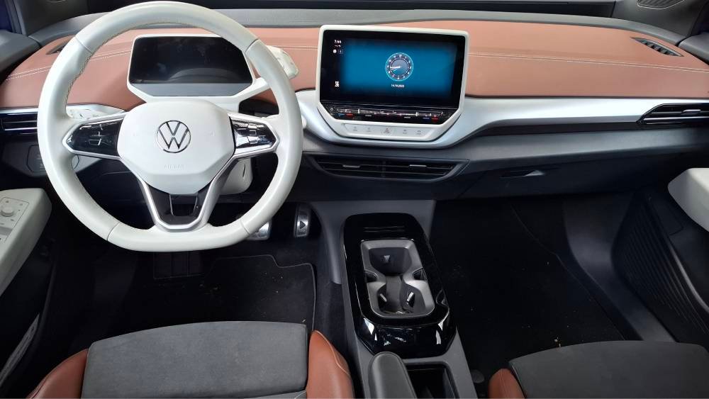 O interior segue o conceito digital da linha ID., com comandos por voz e telas sensíveis ao toque. O painel tem duas telas, uma que faz as vezes de painel de instrumentos e a outra com 12 polegadas traz o sistema multimídia com os ajustes de configuração do carro e os serviços online We Connect Start.